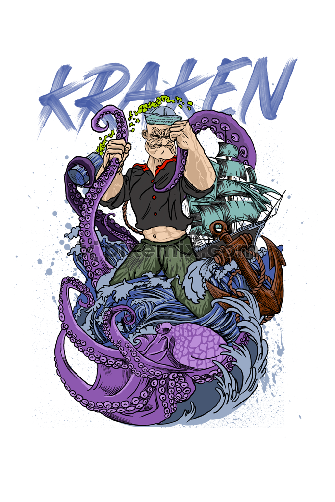Nautical inspired cartoon popeye killing monster octopus with brushed typography