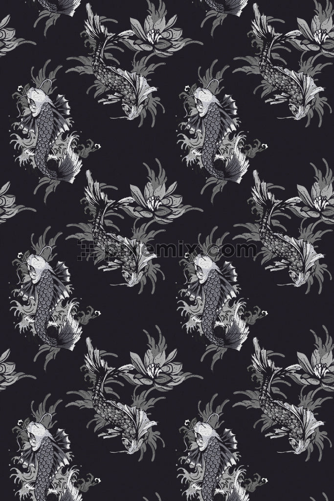 Monochrome dragon fish product graphic with seamless repeat pattern
