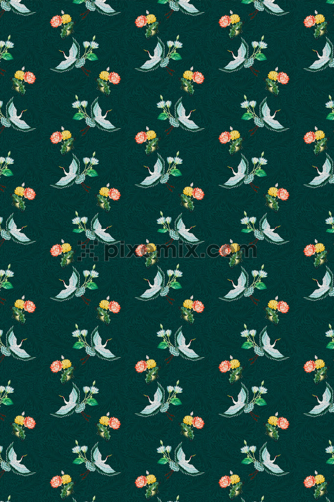 Traditional oriental inspired flying crane product graphic with seamless repeat pattern