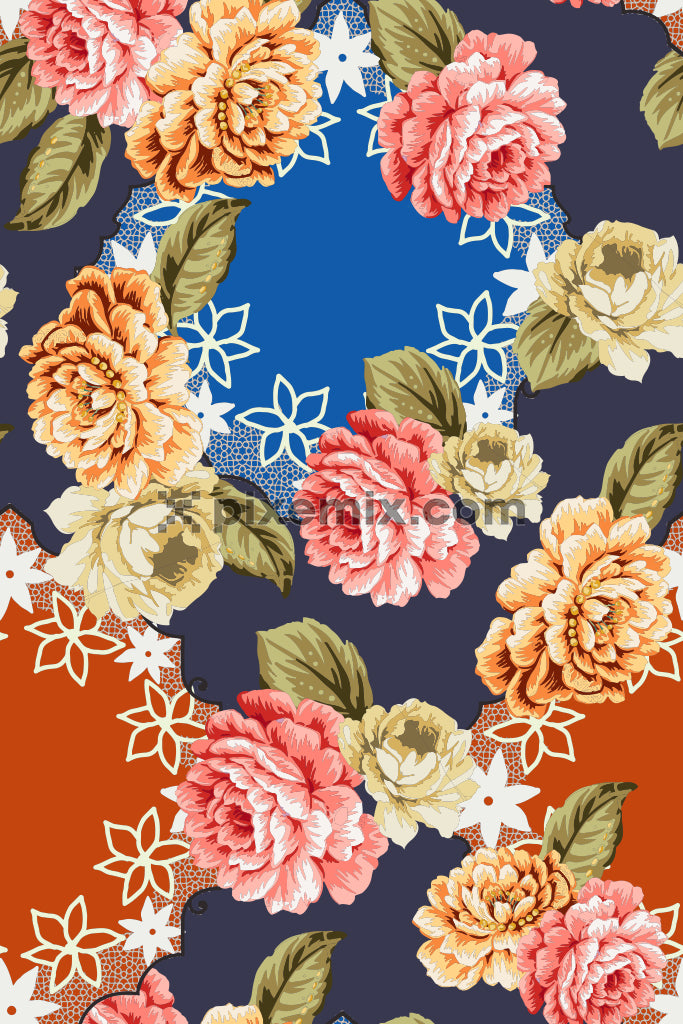 Colorblock floral art vector product graphic with seamless repeat pattern