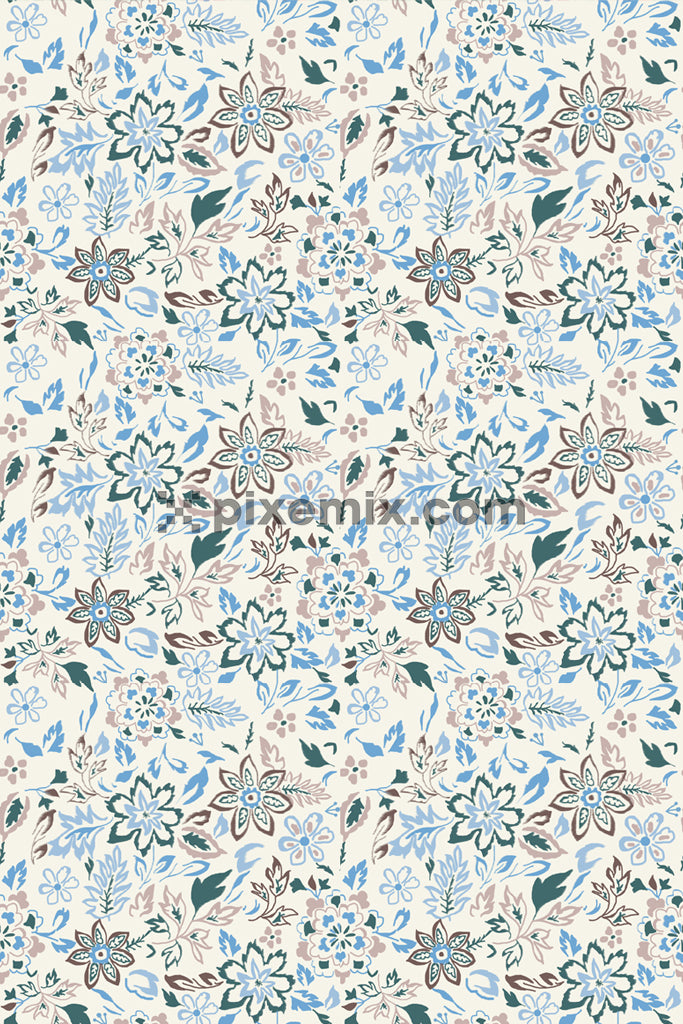 Doodle florals and leaf product graphuc with seamless repeat pattern