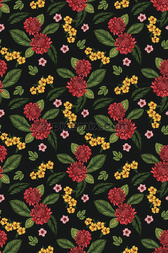 Digital art inspired florals and leaves product graphic with seamless repeat pattern