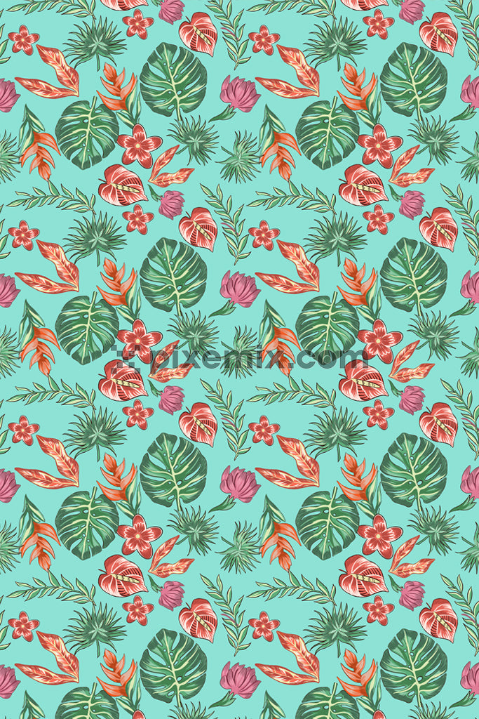 Doodle art inspired topical leaf product graphic with seamless repeat pattern