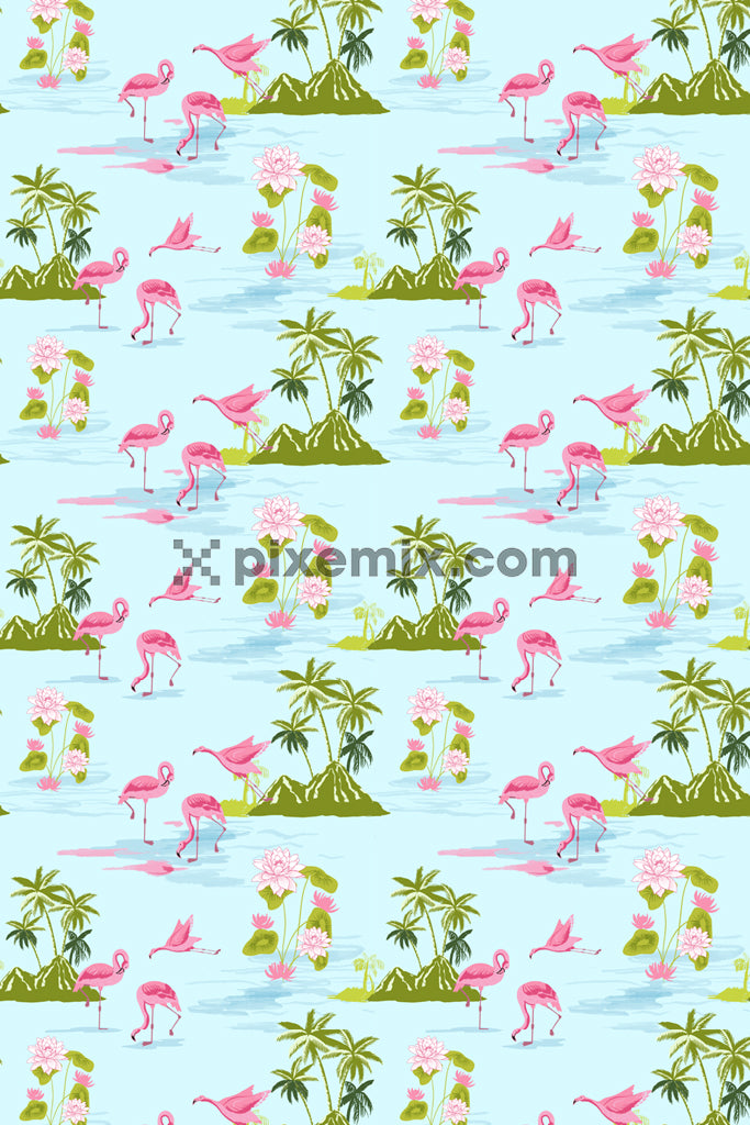 Summervibes inspired flamingo and tree product graphic with seamless repeat pattern