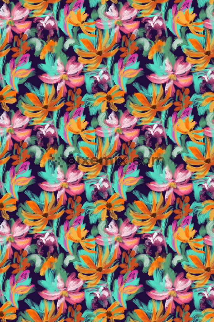 Vibrant hand-painted floral seamless pattern with bold tropical flowers in shades of orange, pink, teal, and purple.