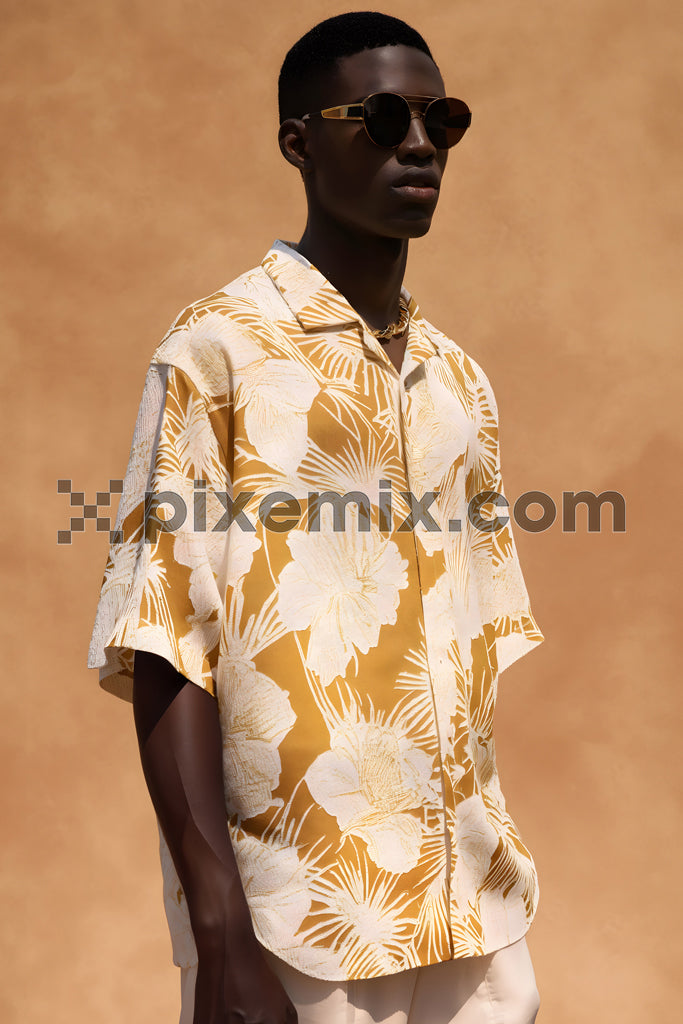 Stylish man in a tropical-print short-sleeve shirt and sunglasses, exuding summer vibes against a warm-toned background stock image.