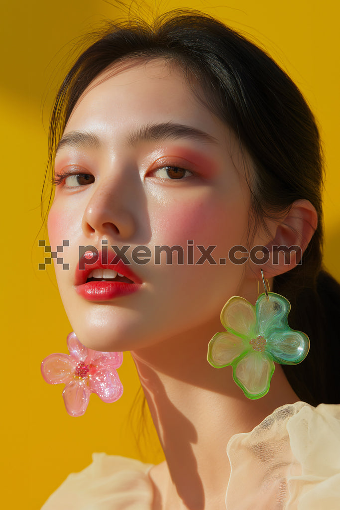 A close-up portrait of a woman with radiant skin, bold makeup, and oversized translucent floral earrings.