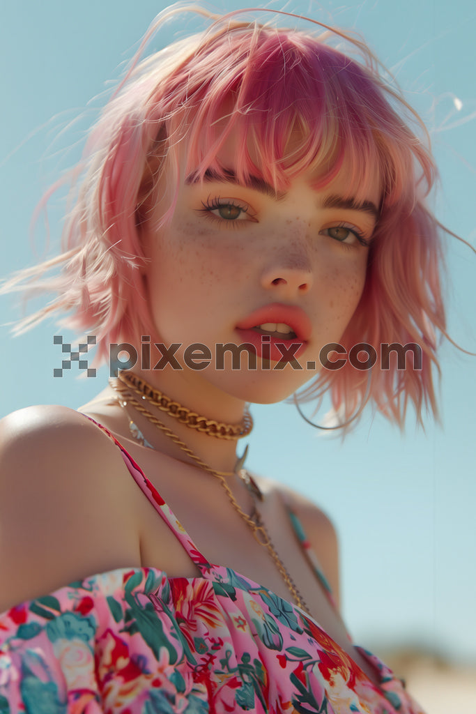 Sunlit beauty with pink hair and floral fashion in a dreamy outdoor setting stock image.