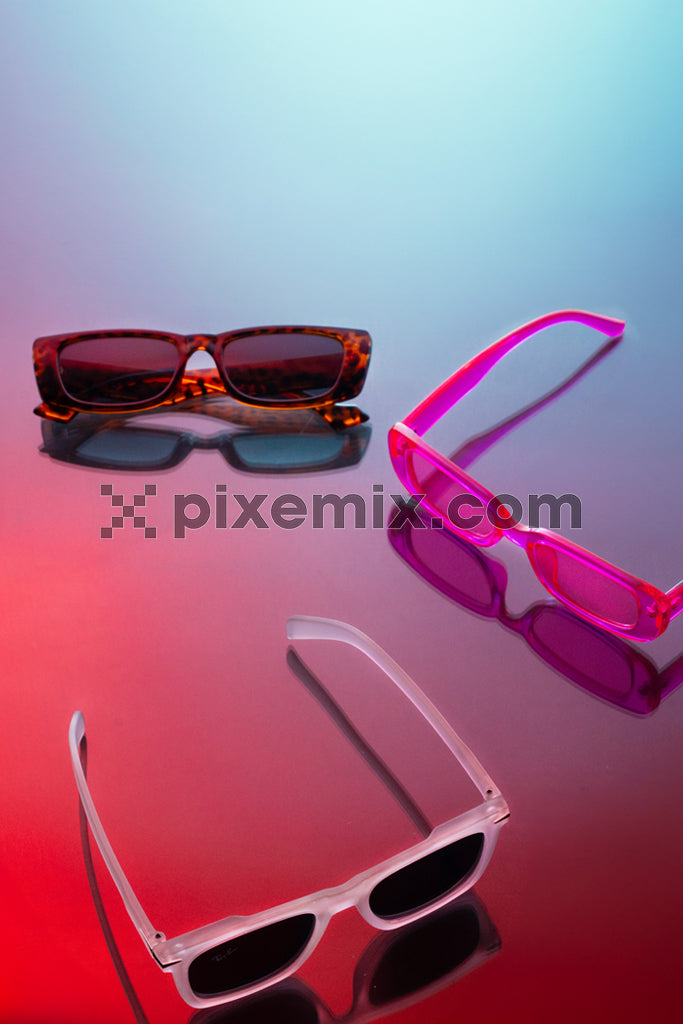 Trendy retro sunglasses collection with colorful reflections on gradient background stock image.