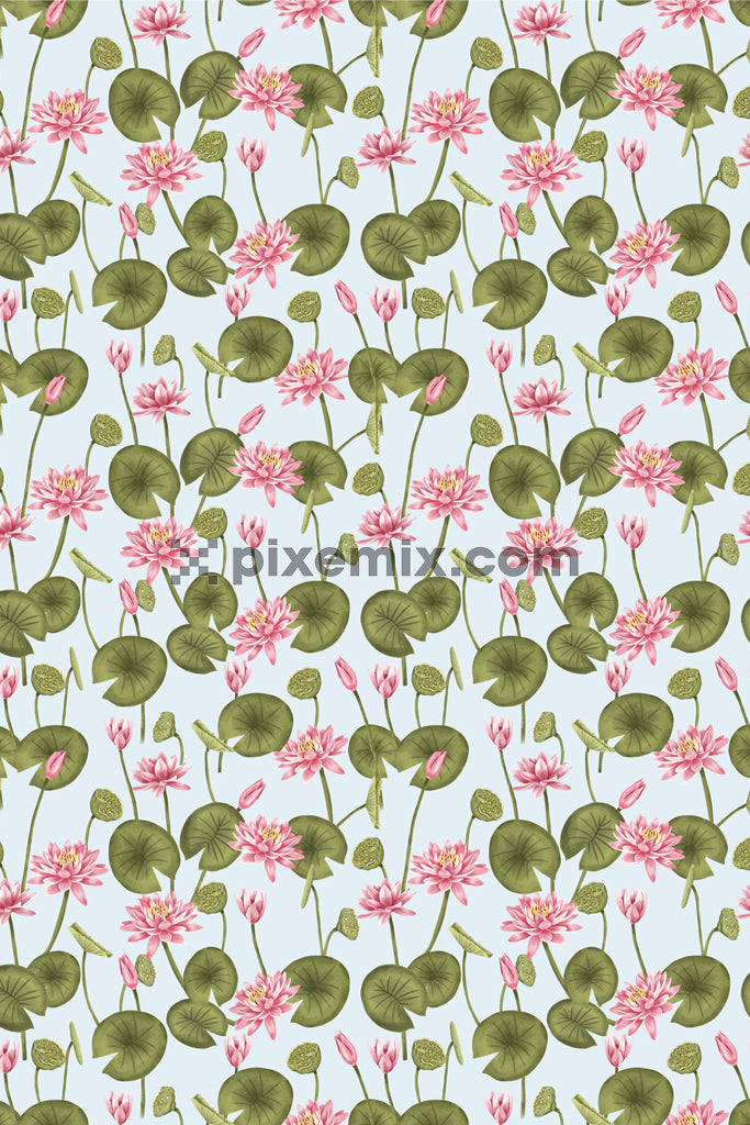 Hand-drawn lotus flower and leaves product graphic with seamless repeat pattern.