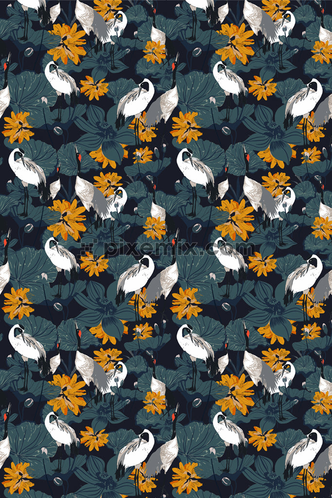 Lotus leafs and cranes product graphic with seamless repeat pattern