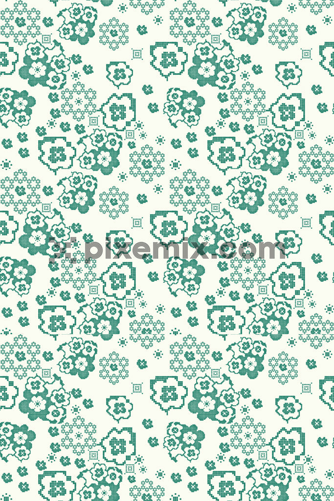 Vintage floral cross-stitch pattern in green tones with pixelated flowers on cream background.