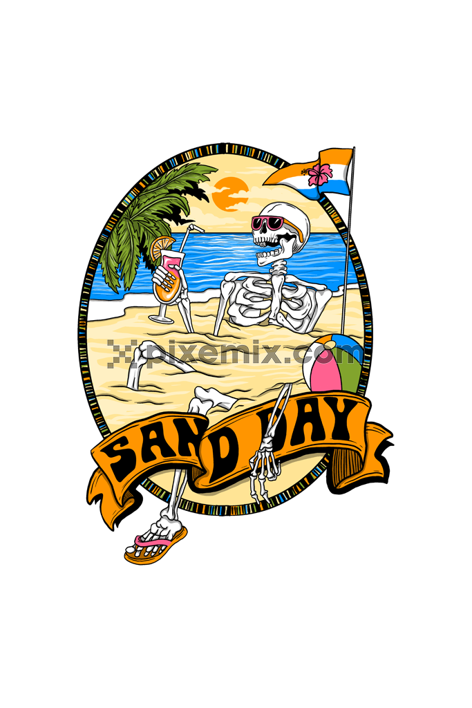 Cool skeleton relaxing on the beach with tropical drinks product graphic.