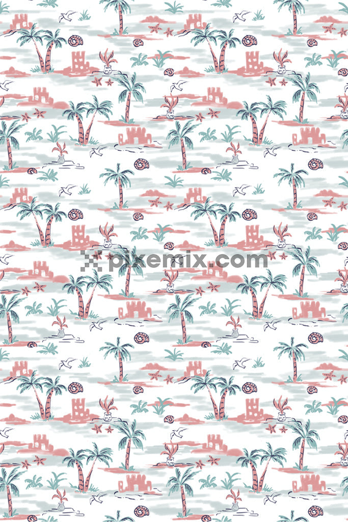 A tropical-inspired seamless pattern featuring palm trees, sandy castles, ocean waves, and coastal elements in a soft pastel color palette.