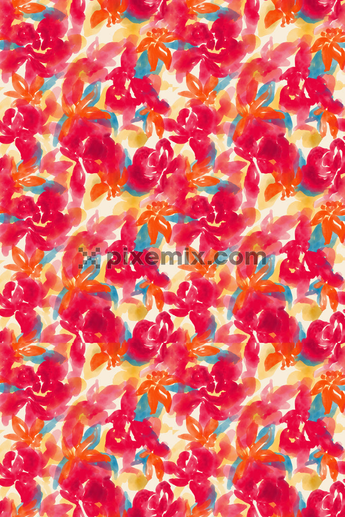 Vibrant watercolor foral pattern with red and orange blooms product graphic.