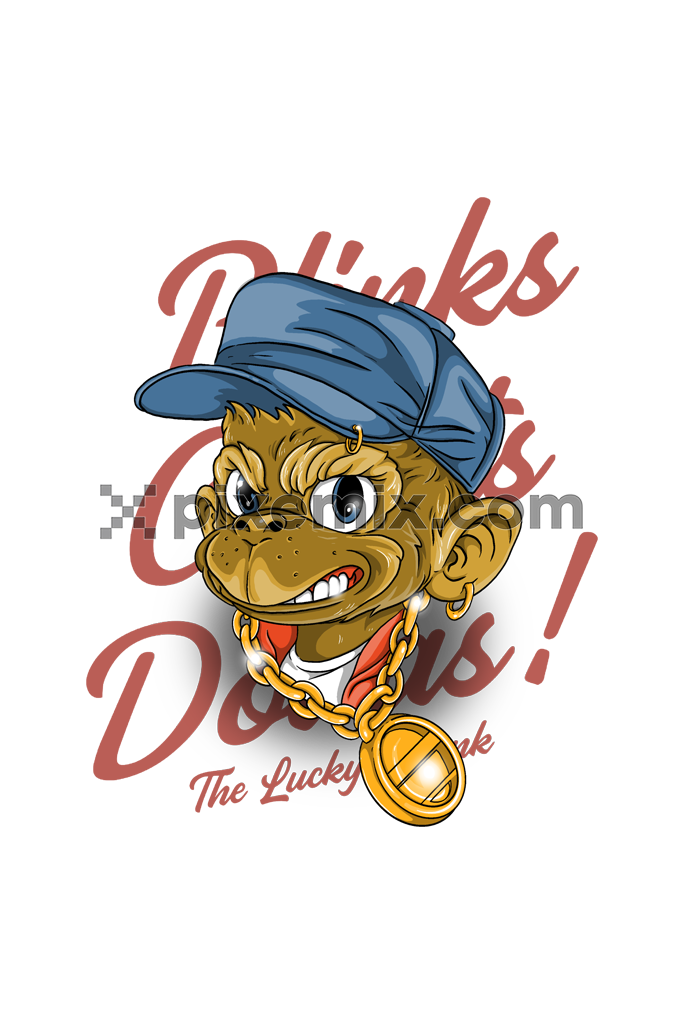 Cool cartoon monkey with gold chain and cap, urban street-style character design illustration.