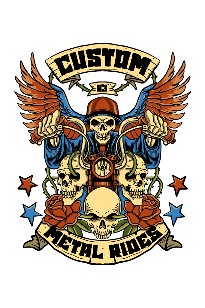 Bold biker-themed graphic featuring a skull rider with wings, multiple skulls, roses, and custom typography with a vintage tattoo-style design.