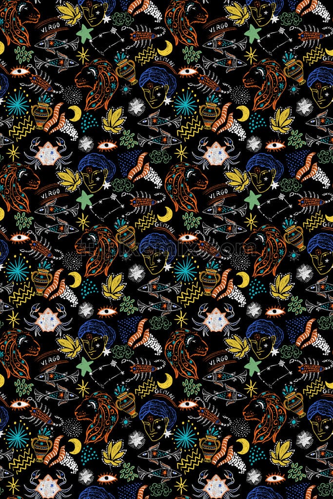 Hand-drawn zodiac sign product graphic with seamless repeat pattern.