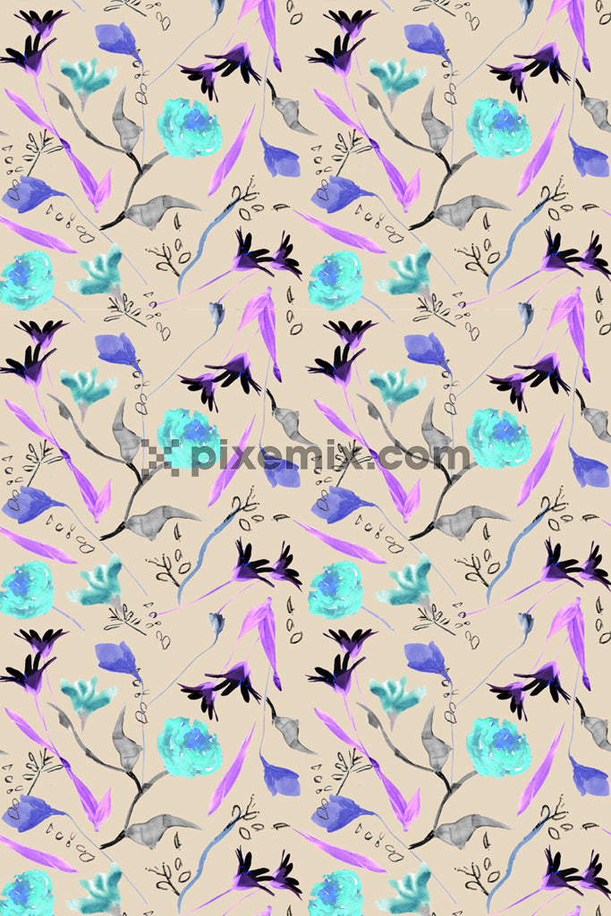 Abstrakte Produktgrafik mit Blumen und Blättern und nahtlosem Wiederholungsmuster