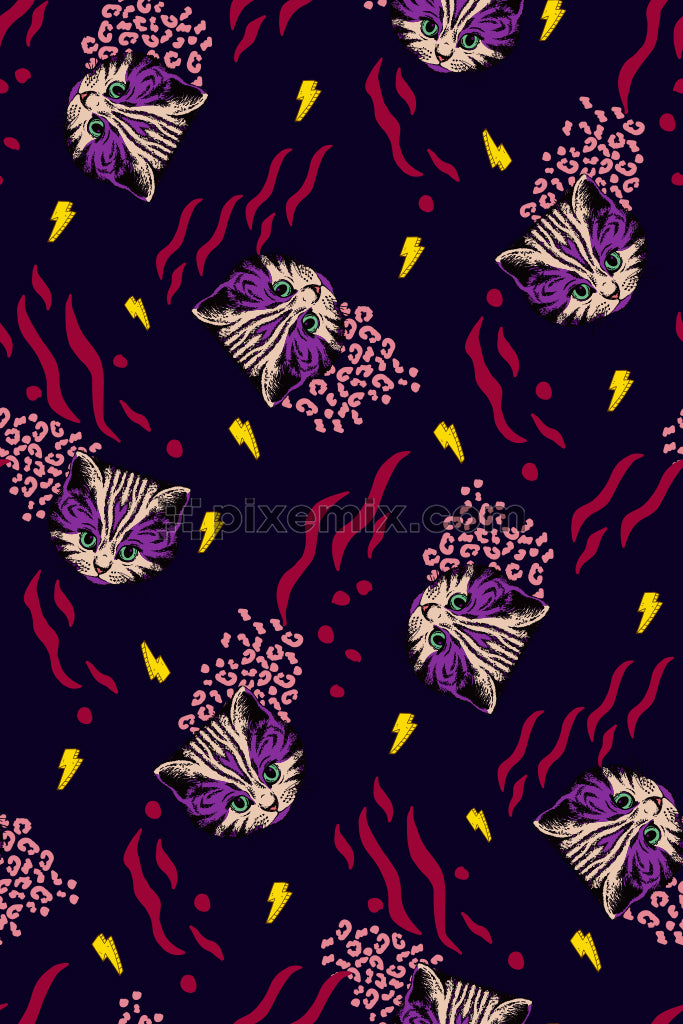 Niedliches Katzengesicht und Produktgrafik mit Animalprint und nahtlosem Wiederholungsmuster