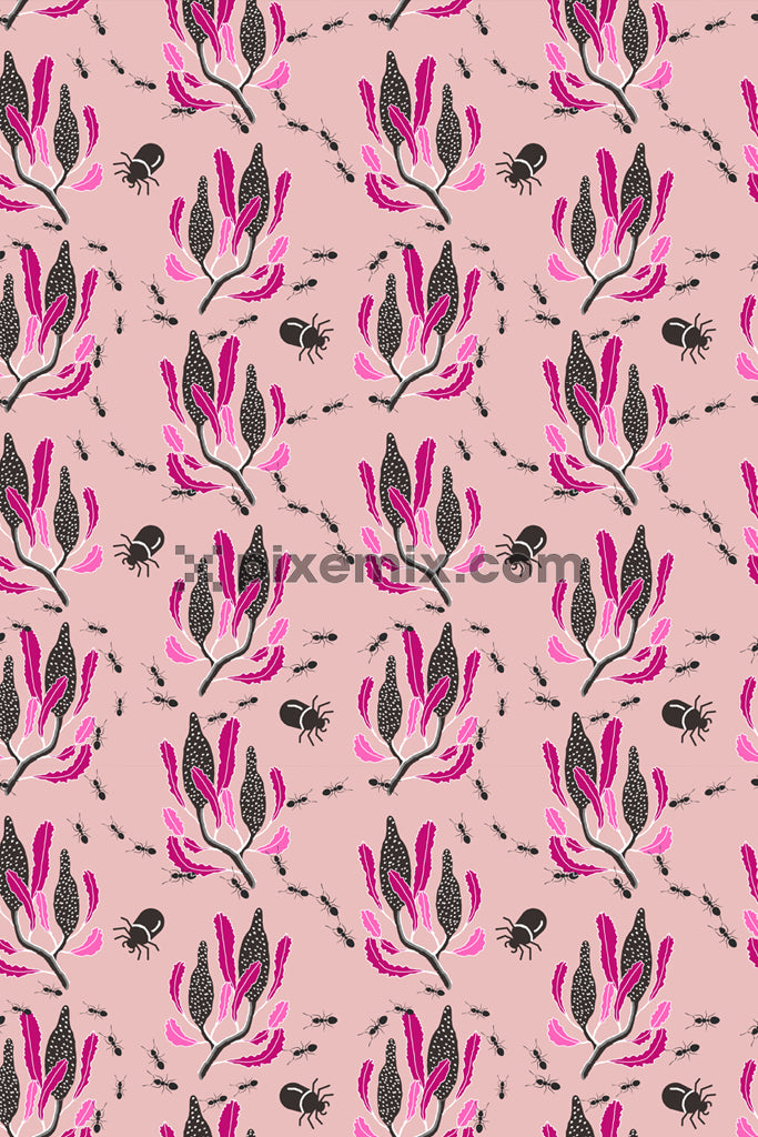 Abstrakte Blätter- und Insektenproduktgrafik mit nahtlosem Wiederholungsmuster