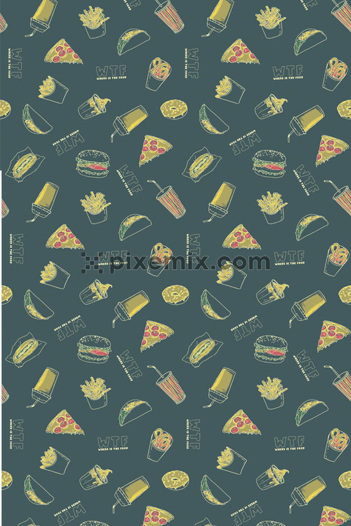 Skurrile, kunstinspirierte Pizza- und Taco-Produktgrafik mit nahtlos wiederholtem Muster