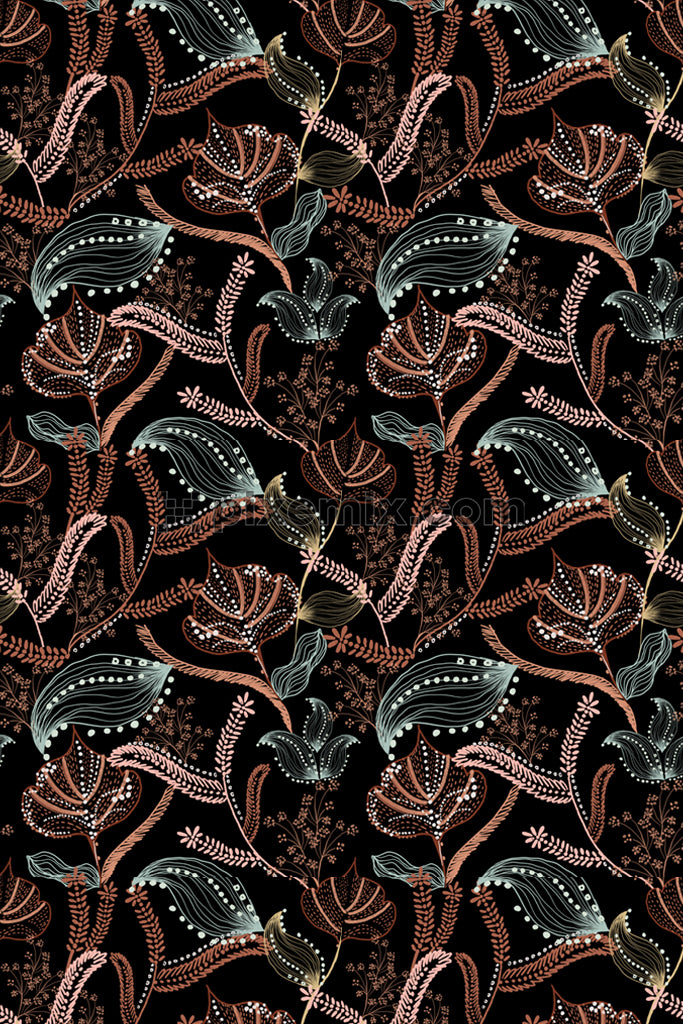 Von Stammes-Strichzeichnungen inspirierte Produktgrafik mit Blättern und nahtlosem Wiederholungsmuster
