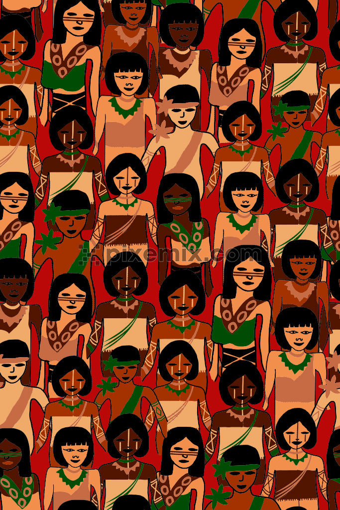 Von Cartoons inspirierte Produktgrafik mit Stammesangehörigen und nahtlosem Wiederholungsmuster