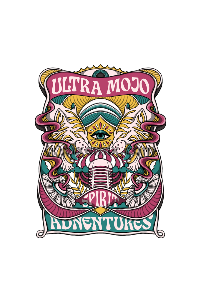 A psychedelic, vintage-inspired illustration featuring bold typography, mystical elements, and intricate detailing.