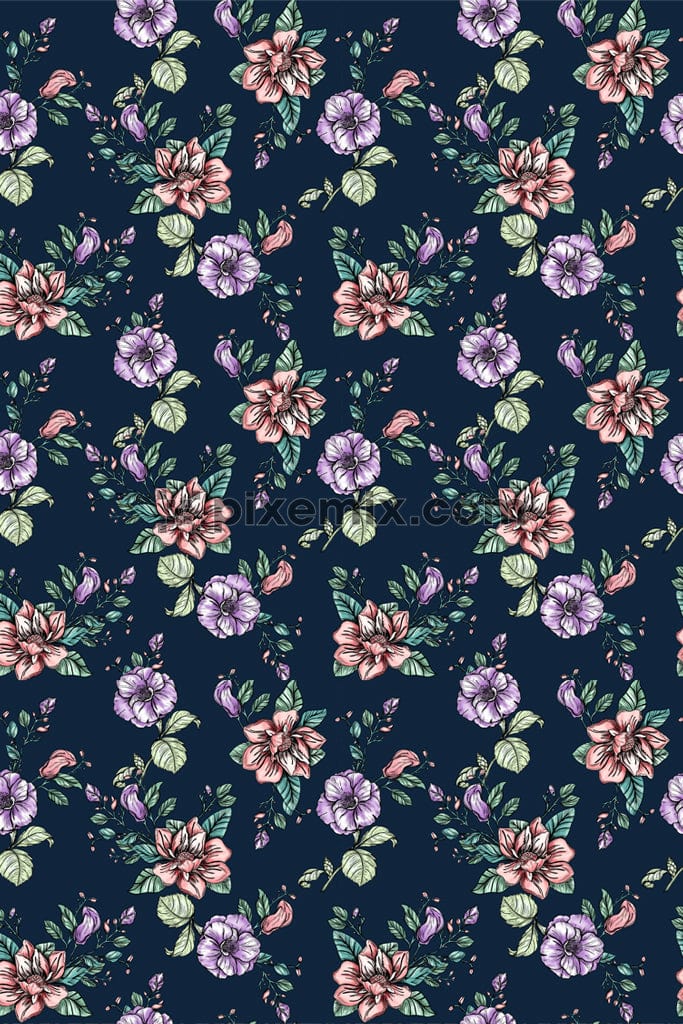 Eine florale, handgezeichnete Blume und Blätter vor einem dunklen Hintergrund, Produktgrafik mit nahtlosem Wiederholungsmuster.