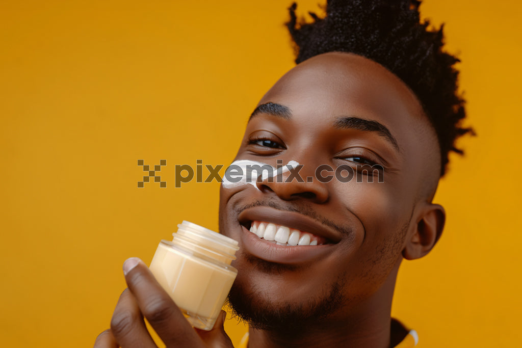 Smiling man applying skincare cream with jar in hand against vibrant yellow background.