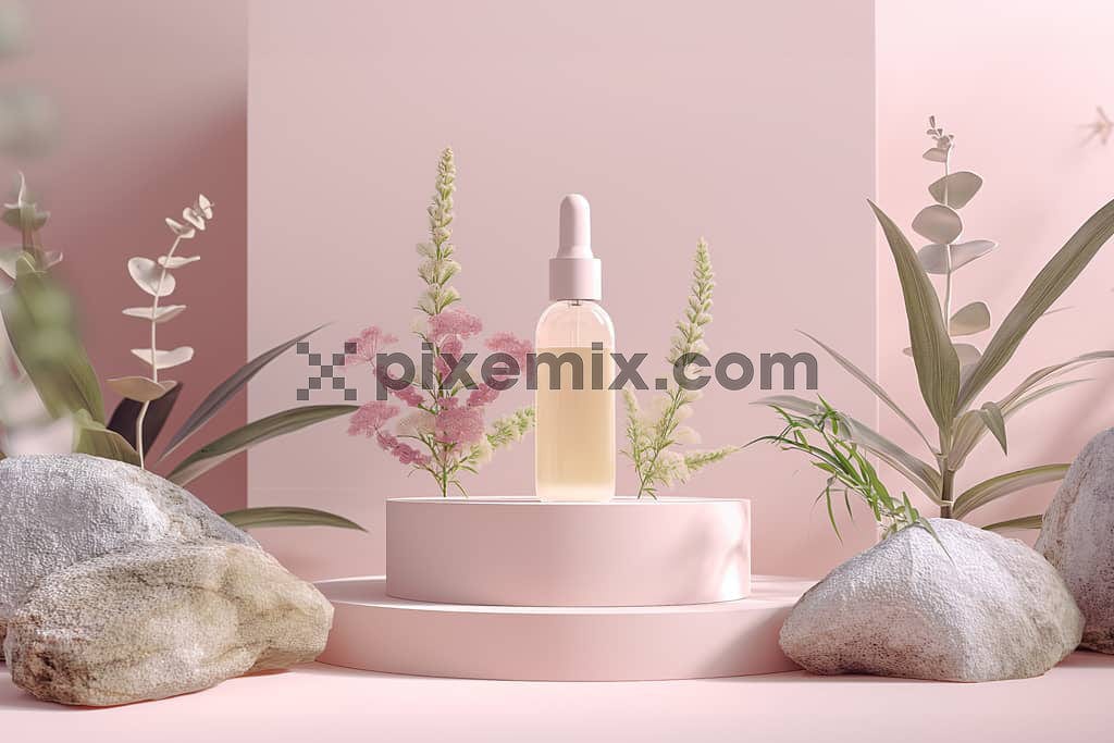 An image of a skincare bottle on a pastel pink background with flowers and rocks.
