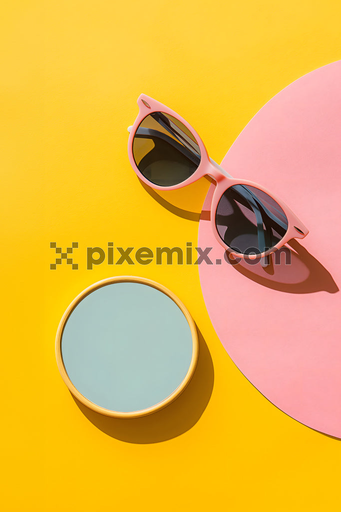 Stylish pink sunglasses with round mirror on vibrant yellow and pink summer-themed background stock image.