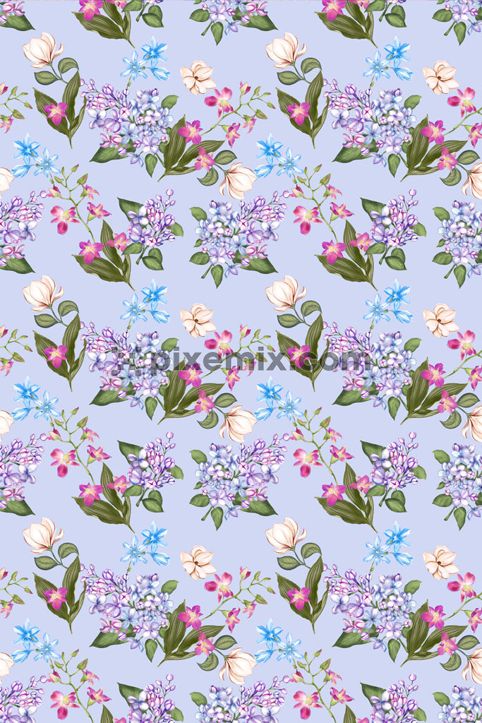 A hand made illustration featuring Digital tropical florals and leaves product graphics with seamless repeat pattern
