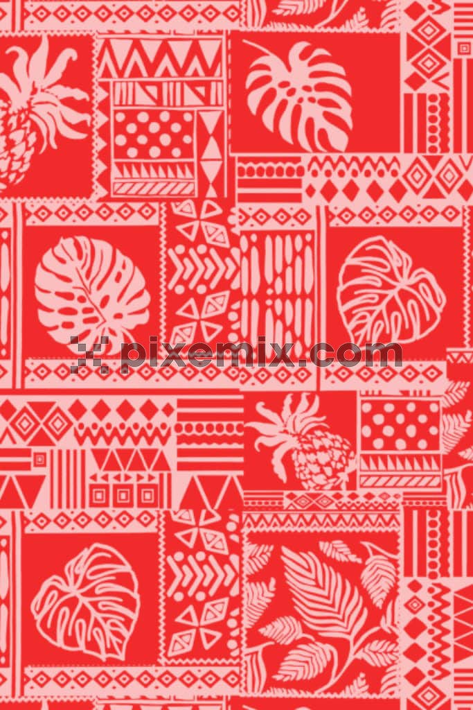 Eine handverlesene Illustration mit tropischen Blättern und Früchten sowie traditionellen Mustern in monochromer Produktgrafik