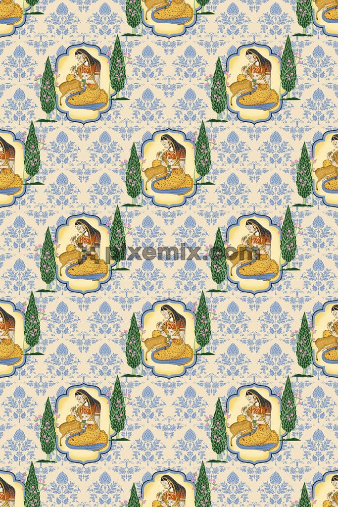 Von der Pichwai-Kunst inspirierte Mogulfrauen und teure Produktgrafik mit sich nahtlos wiederholendem Muster