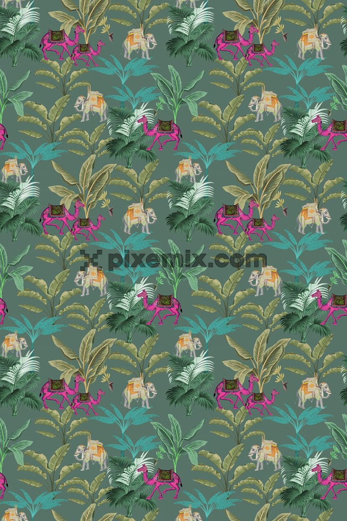 Von der Pichwai-Kunst inspirierte Bananenstauden- und Kamel-Produktgrafik mit nahtlos wiederholtem Muster