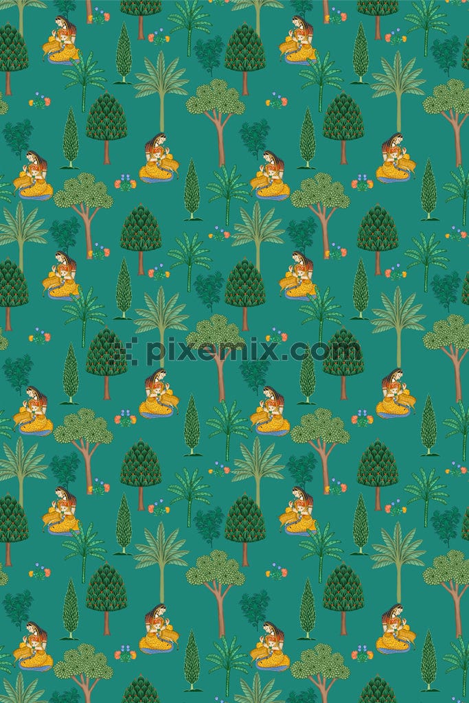 Von der Pichwai-Kunst inspirierte Mugal-Garten-Produktgrafik mit nahtlos wiederholtem Muster