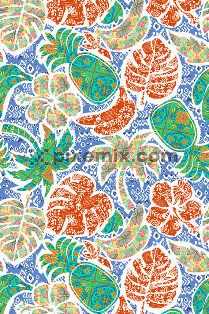 Tropical fruit and leaf pattern with vibrant textures and tribal blue background product graphic.