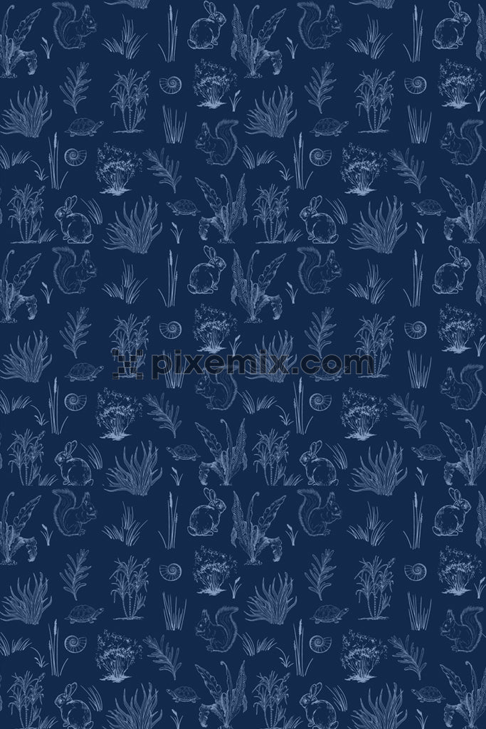 Von Lineart inspirierte Produktgrafik mit tropischen Tieren und Blättern mit nahtlos wiederholtem Muster