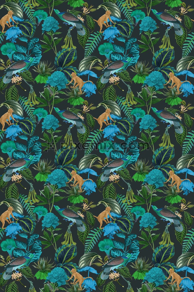 Ein nahtloses, sich wiederholendes Muster aus Flora und Fauna in hellen Grün- und Blautönen mit dunklem Hintergrund