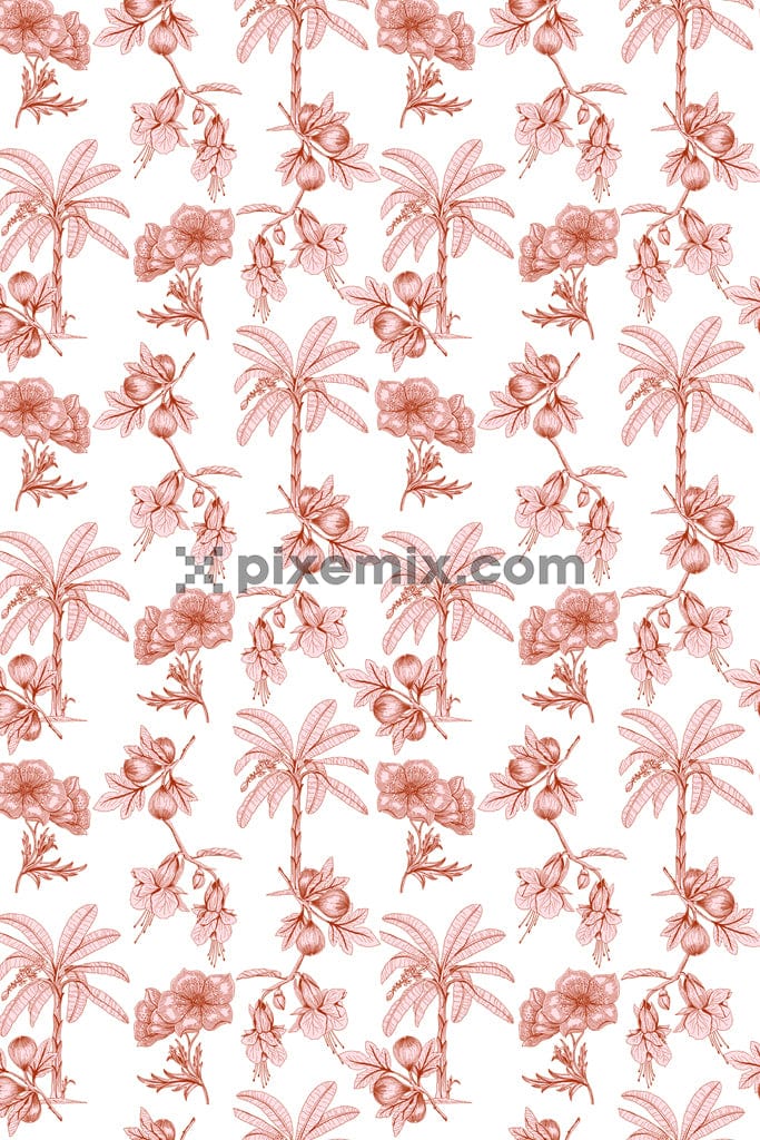 Eine handgezeichnete monochrome digitale Kunst von Blumen, Früchten und Bäumen mit einem nahtlosen, sich wiederholenden Muster.
