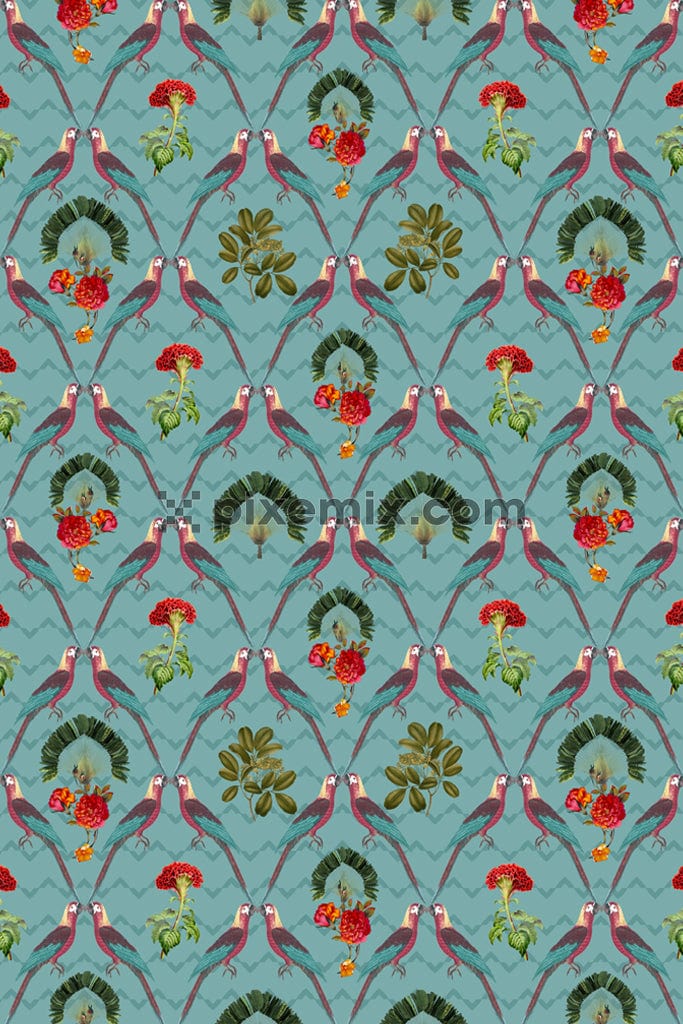 Tropische Ara- und Streifenproduktgrafik mit nahtlosem Wiederholungsmuster