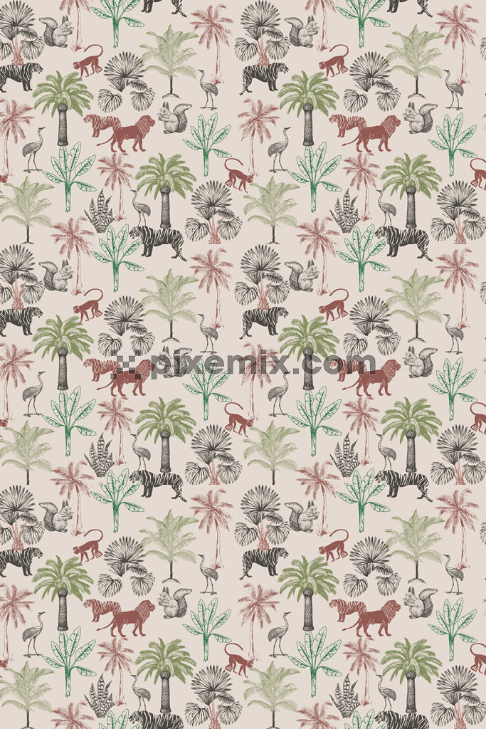 Vintage jungle safari pattern with lions, monkeys, birds, and tropical trees product graphic.