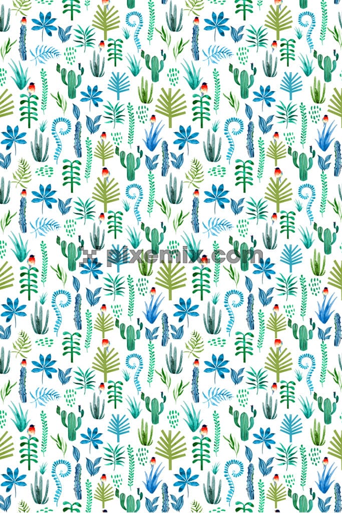 Produktgrafik mit Pflanzen und Blumen in Aquarellfarbe und nahtlosem Wiederholungsmuster