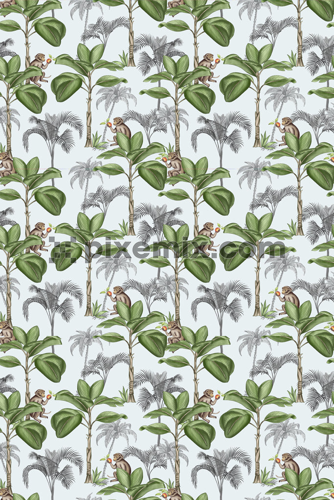 A playful tropical jungle scene with monkeys and lush banana leaves in seamless repeat pattern.