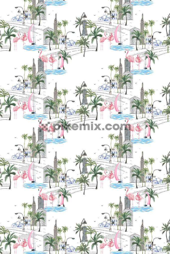 Von tropischer Kunst inspirierte Stadt- und Flamingo-Produktgrafik mit nahtlos wiederholtem Muster
