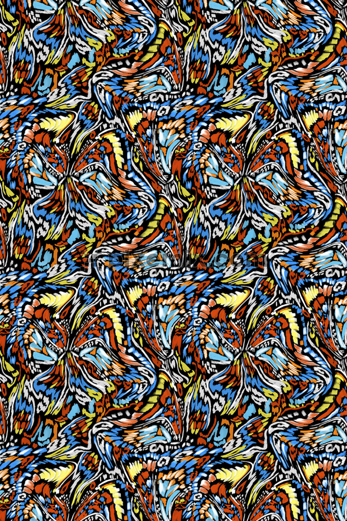 Vibrant butterfly wing pattern with abstract artistic strokes in bold colors, creating a dynamic and surreal textile design.