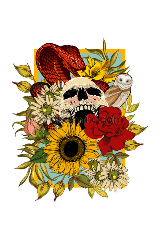 Gothic-inspirierter Totenkopf und Schlange mit floralen Produktgrafiken mit nahtlos wiederholtem Muster