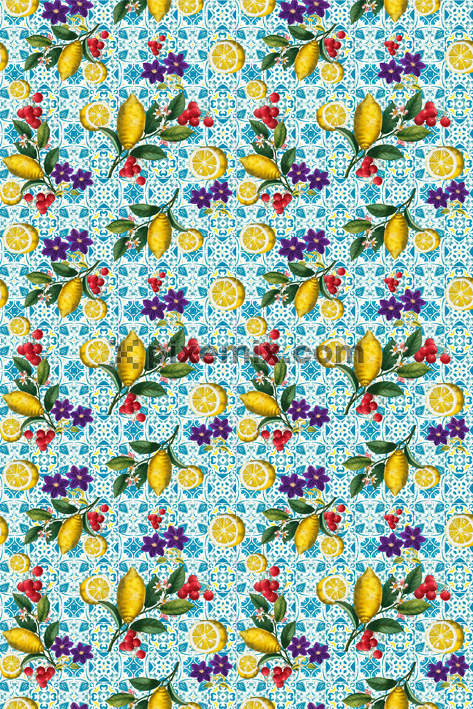 Blatt- und Zitronenproduktgrafiken mit nahtlos wiederholtem Muster